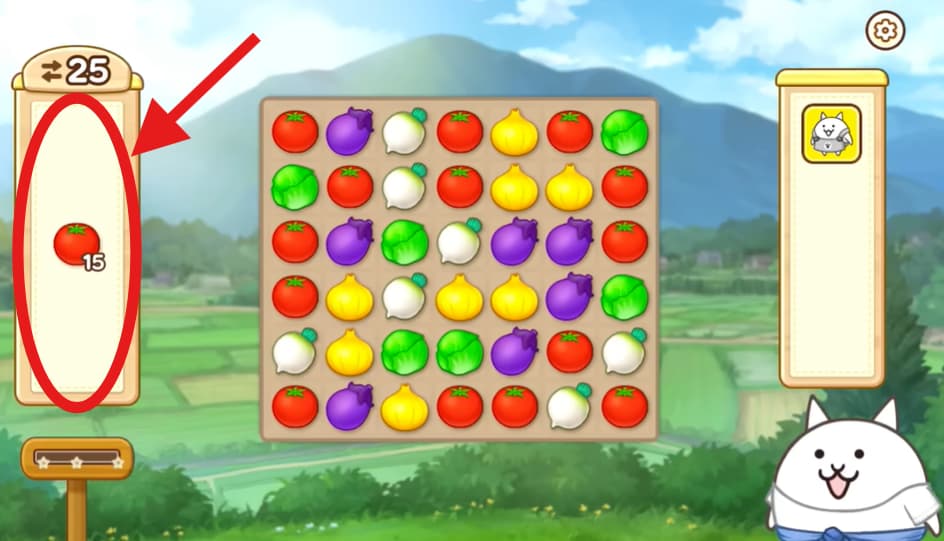 赤丸に書いてある野菜をその数だけ消すと、ステージクリアになります。